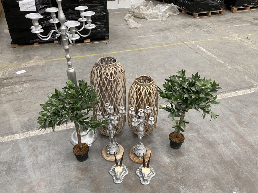 A tall standing candelabra, two small candelabras, two wicker candle lanterns, two small artificial plants and two small taxidermy skulls.