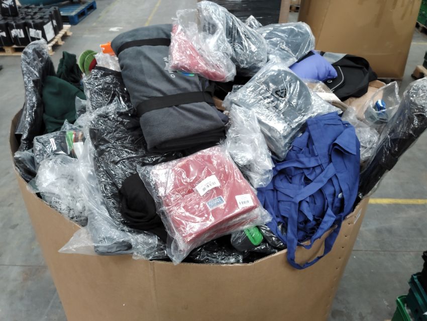 A pallet of assorted corporate stock including clothing, accessories and related.