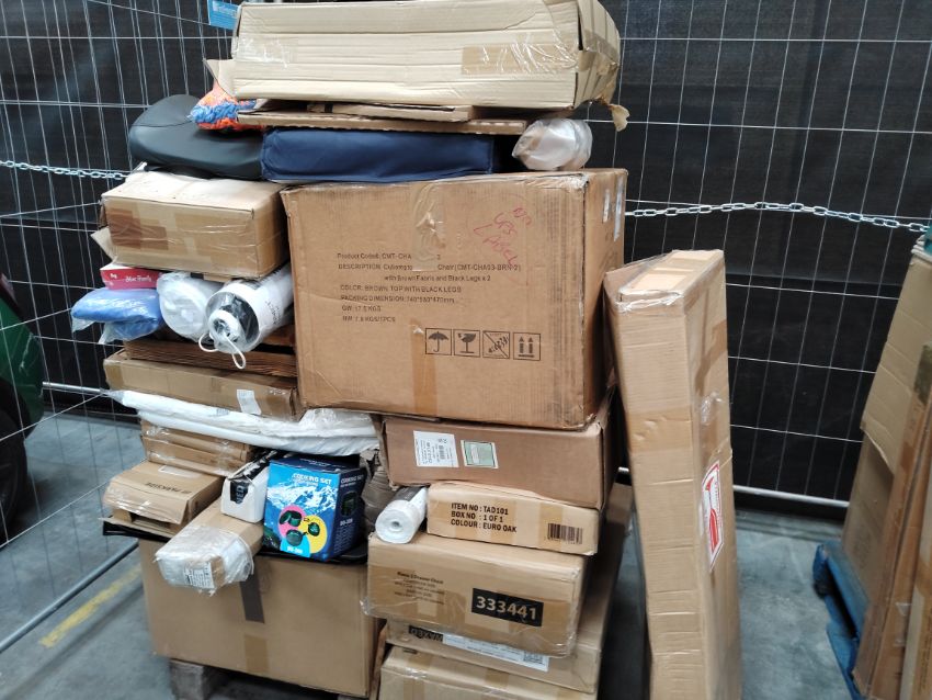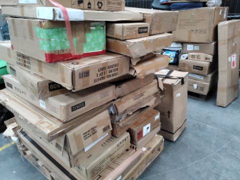 Two pallets of assorted homeware and related goods, with one pallet of assorted flatpack.