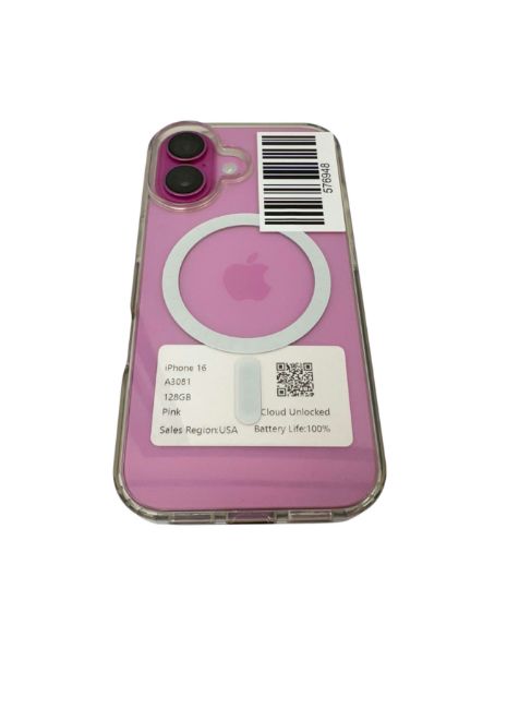 Pre-owned Apple iPhone 16 (US/A3081) 128GB in Pink (iCloud account unlocked) (Battery health: 100%) (https://www.checkmend.com/uk/verify/CM21311963-887AE).