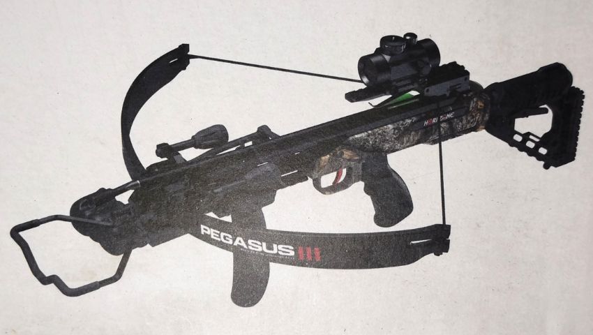 An as new Hori-Zone Pegasus III recurve crossbow, 275 FPS speed, draw weight - 185 lbs, box opened and slightly worn (stock image) (over 18s only).