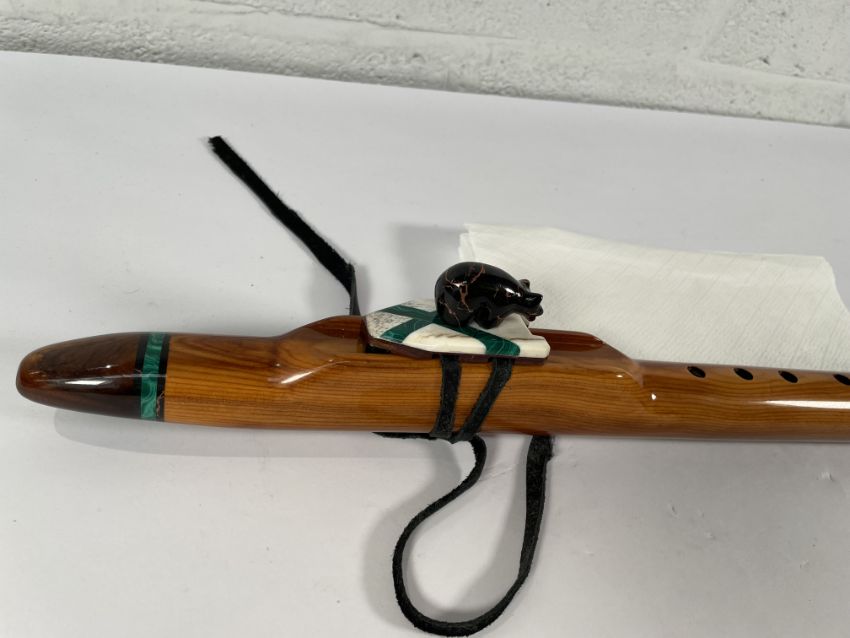 An as new Woodsounds Mid G-4 T3J handcrafted flute with a black bear totem.