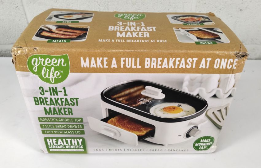 As new GreenLife 3-in-1 Breakfast Maker, (CC006796-001). *UK plug adapter needed.