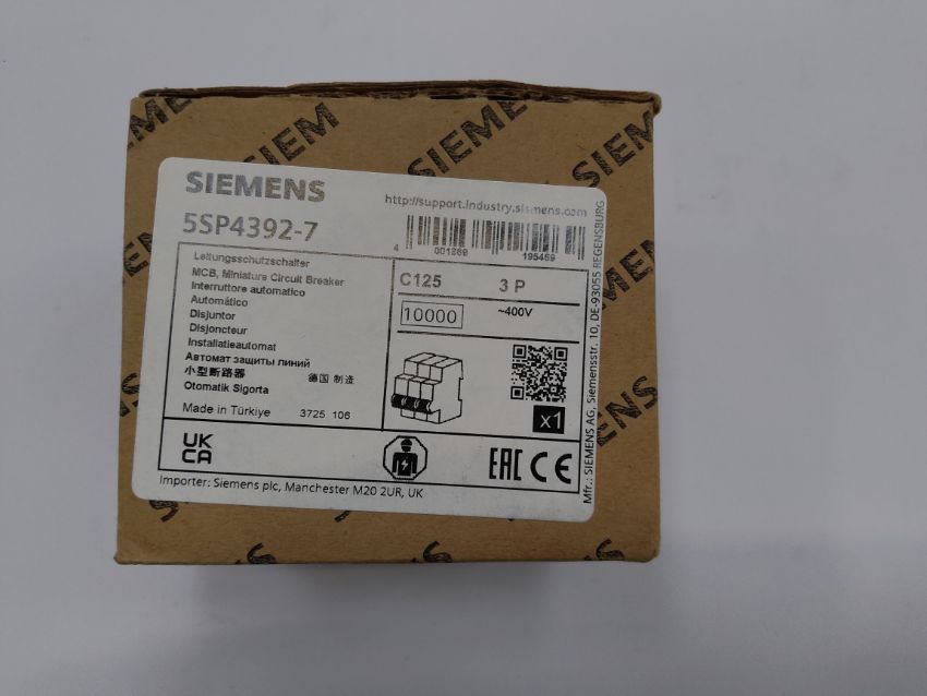 As new Siemens 5SP4392-7 miniature circuit breaker 400 V 10kA, 3-pole, C, 125 A, D=70 mm.