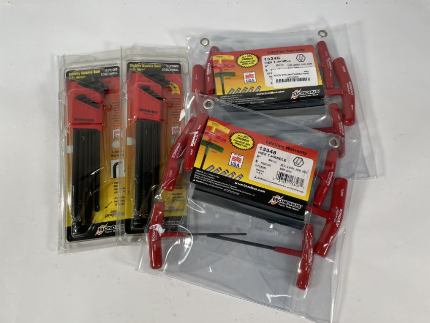 Two Bondhus, HTX60M 6PC 2-6MM T-Handle HEX, 13348 and two Bondhus, SDBLX9MXL Stubby Double Ballend Hex Key 1.5MM-10MM, 67099, all as new.