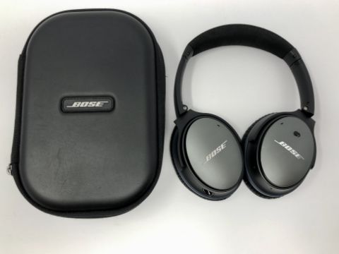 A pre-owned pair of Bose QuietComfort 25 Acoustic Noise Cancelling Headphones in Grey with case (Some damage to ear pad material. A couple small chips to casing).