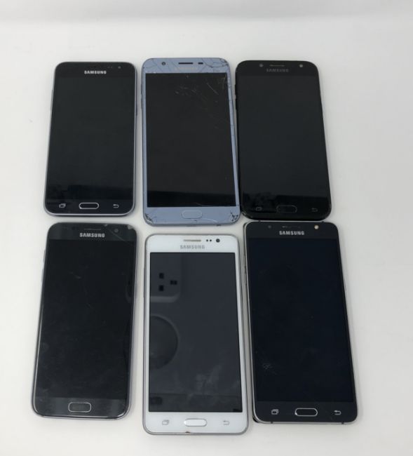 Six assorted pre-owned Samsung smartphones sold for parts; 1x Galaxy S7 SM-G930F, 1x Galaxy J5 PRO SM-GJ530F, 1x Galaxy J7 Star SM-J737T, 1x Galaxy J5 SM-J510FN, 1x Galaxy J3 SM-J320FN and 1x Galaxy On5 SM-G550T1 (All items FRP locked, all with some damage to screen glass and/or casing) (Sold for parts only).