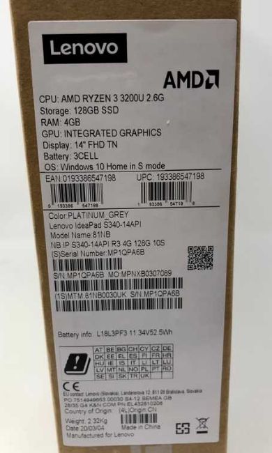 A boxed as new Lenovo Ideapad S340-14API 81NB 14" Full HD Laptop in Platinum Grey with AMD Ryzen 3 3200U 2.60 GHz Processor, 4GB RAM, 128GB SSD running Windows 10 S (Box sealed).