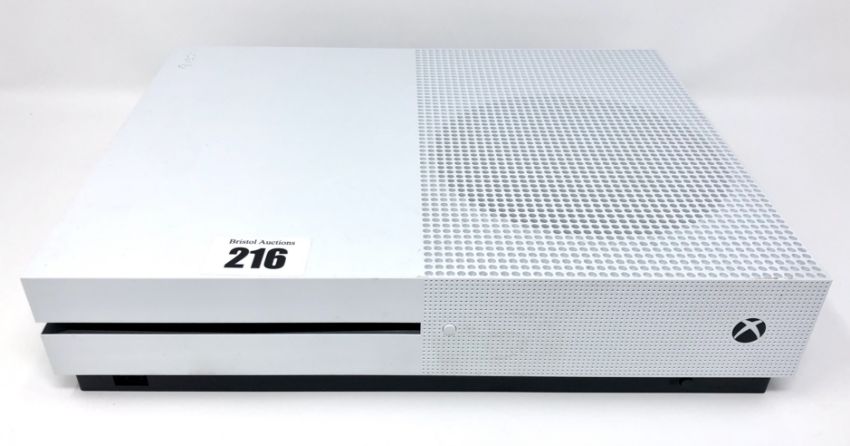 A pre-owned Microsoft Xbox One S 1681 with two controllers, power cable and HDMI cable.