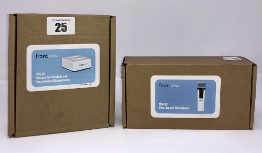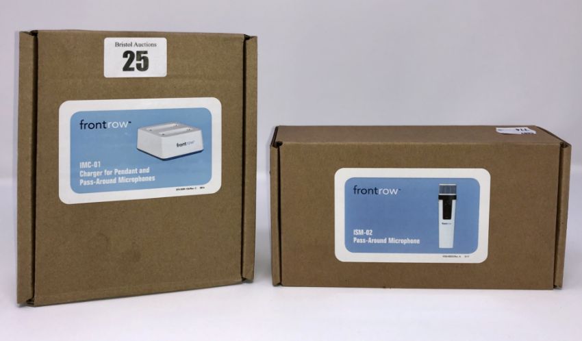 A boxed as new FrontRow ISM-02 Pass-Around Microphone and a boxed as new FrontRow IMC-01 Charger for Pendant and Pass-Around Microphones (Boxes opened).