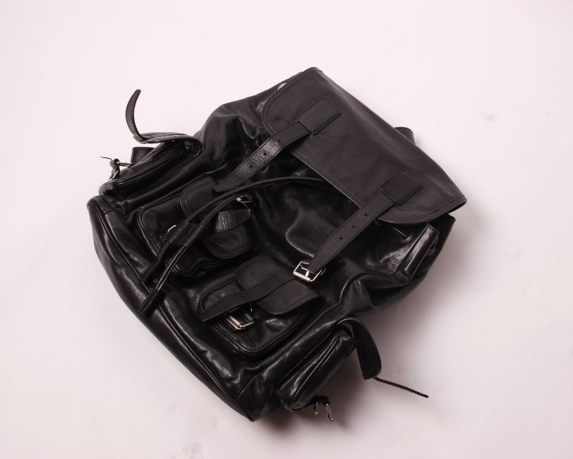 A pre-owned black leather Saint Laurent back pack with multi pouches to body.