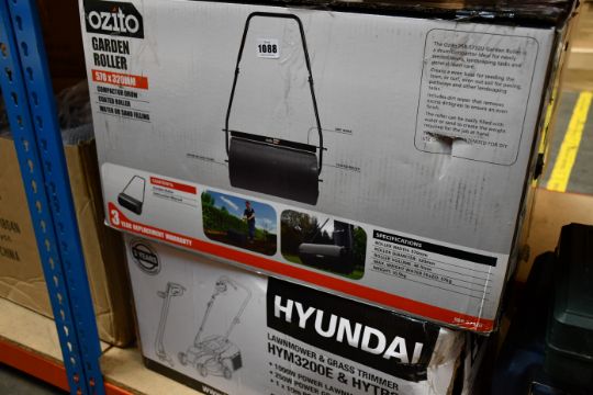 A boxed as new Hyundai lawn mower and an Ozito garden roller.