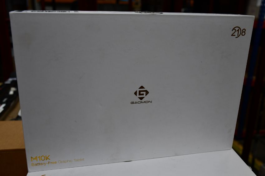 A pre-owned Gaomon M10K 10" x 6.25" Battery Free Graphics Tablet and Stylus Pen (Box opened, some cosmetic damage to box).