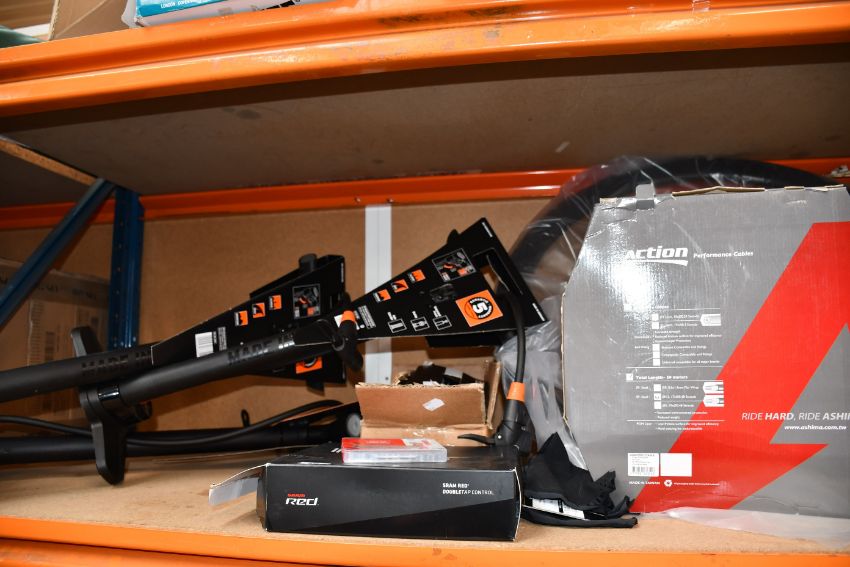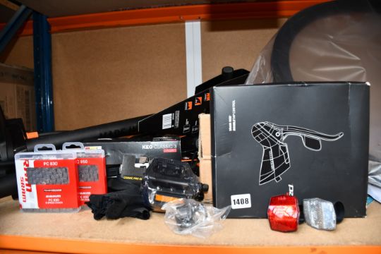 A quantity of as new bike equipment and related items to include Mavic bike rim, one KEO Classic 3 Plus grip cleats and SKS Germany bike pumps.