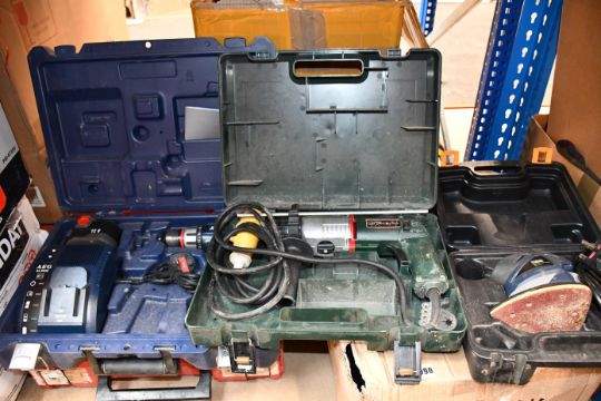 A pre-owned AEG AVS hammer drill (body only), a pre-owned AEG cordless drill with batteries and charger, a pre-owned Metabo hammer drill and a pre-owned MacAllister sander.