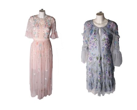 One Frock & Frill Ginger Ruffled Tie-Neck Embellished Midi Dress in skyway blue (12) and one Frock & Frill Fillippa Short Sleeve Embellished Maxi Dress (12), both as new.