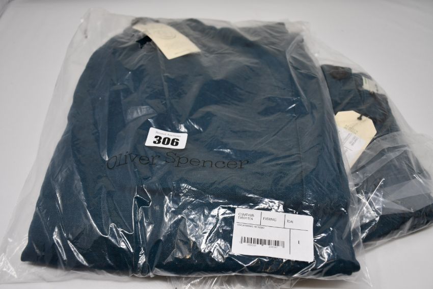 Two pairs of as new Oliver Spencer Ecological Evering drawstring trousers (1 x S, 1 x L).