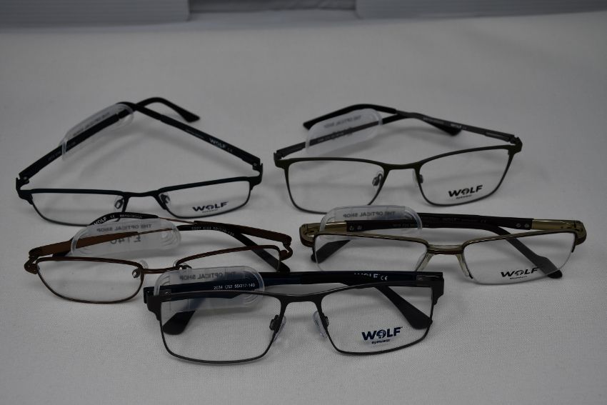 Five pairs of as new Wolf glasses frames with clear glass (RRP £140 each).