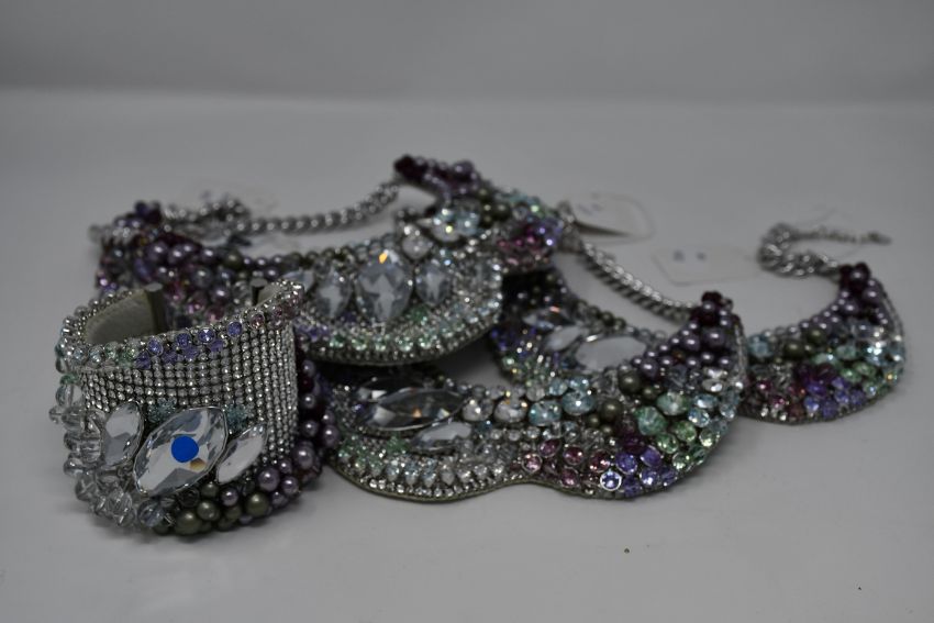 Four Swarovski crystal evening dress necklaces with leather backs and one cuff (No Tags).