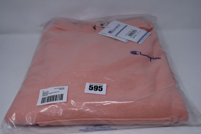 Two as new Champion relaxed hoodies with chest logo in light pink (1 x M, 1 x L).