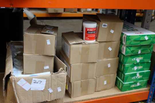 A box of Fire Exit signs (Approximately 100 in the box), six LED Maintained Emergency signs and nine boxes of fire extinguisher sterilising tablets (Six pots in a box) (Expiry 03/2022).