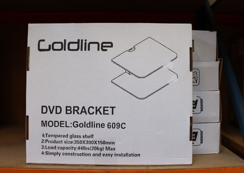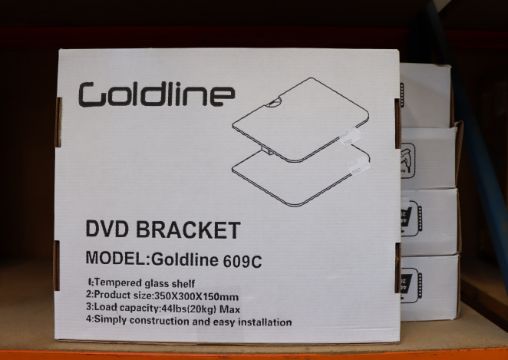 Five boxed as new Goldline tempered glass shelf DVD brackets (609C).