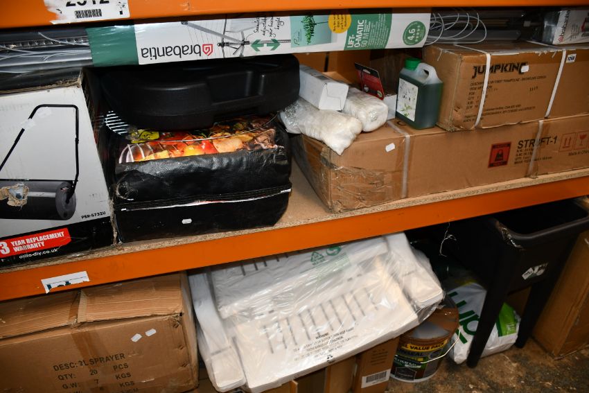 A quantity of garden related items to include two boxed as new trampolines, one boxed as new Ozito garden roller and one as new Brabantia Lift-O-Matic rotary dryer.