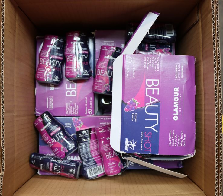 A quantity of as new Midway Glamour Nutrition Beauty Shots - grape flavour (Approximately 100 x 60ml, expires: 04/21).