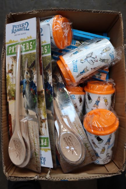 A quantity of assorted as new Peter Rabbit 2 merchandise to include Farmer's Market headphones, cups, wooden spoons and pencils.