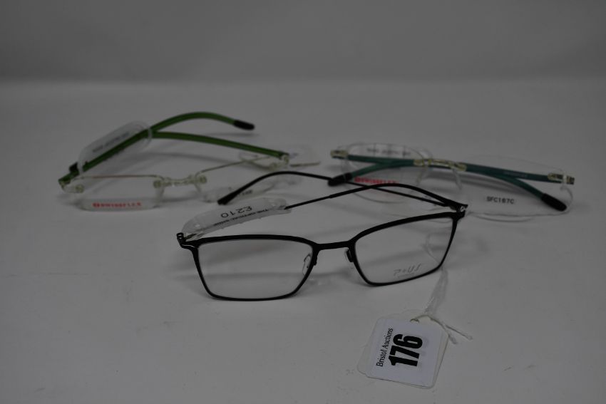 Two pairs of as new SwissFlex glasses frames with clear glass (RRP £200 each) and a pair of as new P+US Combo glasses frames with clear glass (RRP £210).