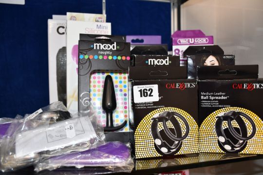 A Doc Johnson Sasha Grey vibrating deep throat sucker, a Doc Johnson mood pleasure thick ribs male masturbator, two CalExotics medium leather ball spreaders, two Doc Johnson Mood Naughty Silicone 3.5 inch medium silicone butt plugs, five CalExotics slim tear drop bullets, a Pipedream Dillio perfect fit strap on harness, a Pipedream fetish fantasy series beginners six piece cupping set, a Doc Johnson Vac u Lock 8 inch raging hard on dong, a Pipedream 6 inch uncut king cock and a Cal Exotics mini silicone clitoral pump (Over 18s only).