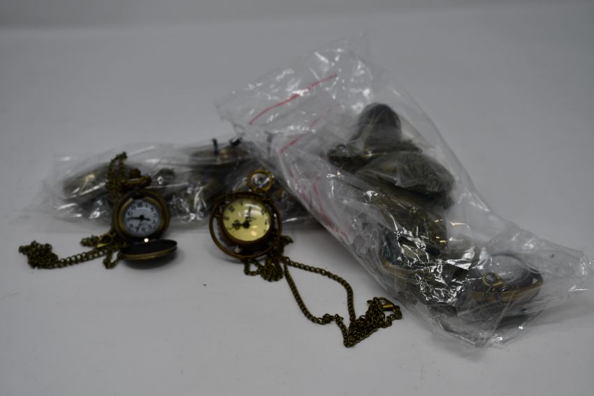 A quantity of as new Quartz novelty pocket watch necklaces to include Harry potter and The Deathly Hallows Quartz necklace pocket watch and one gear carved pocket watch.