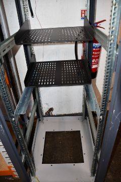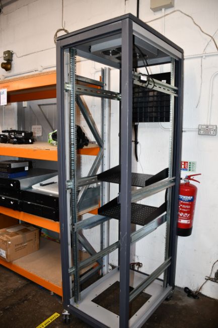 A quantity of IT items to include; an Avid Adrenaline edit controller, an APC 750 Smart UPS, two Belkin OmniView rack-mount consoles, a Dell PowerEdge 860 Server, four Belkin OmniVeiw PRO2 8-port KVM Switch, five empty server cases, a Dell Power Connect 2716, a Linksys SR216 16-port 10/100 switch, a Netgear FS524 16-port 10/100 switch, a Net-c Cat.5e 24-port, a heavy duty rack shelf and a 7ft wheeled server rack (20 items).