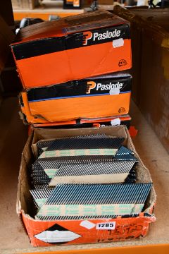 Three boxes of Paslode nails with two fuel cells in each box (141233 - 3.1 x 90mm smooth, 141074 - 3.1 x 90mm ring, 141234 - 3.1 x 90mm smooth) along with one other opened box.
