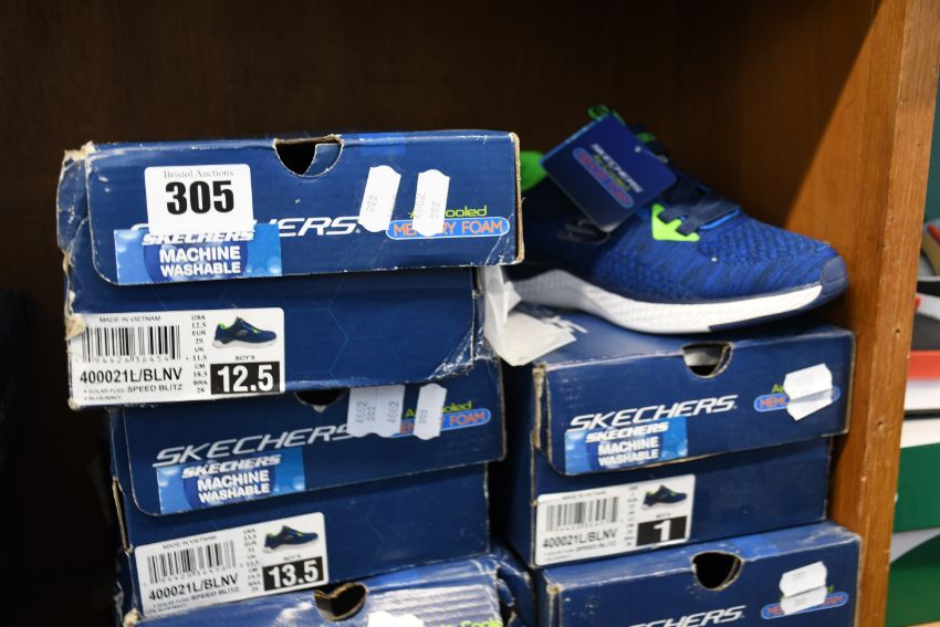 Five pairs of children's as new Skechers Speed Blitz trainers (UK 11.5, 12, 12.5, 13, 1.5).