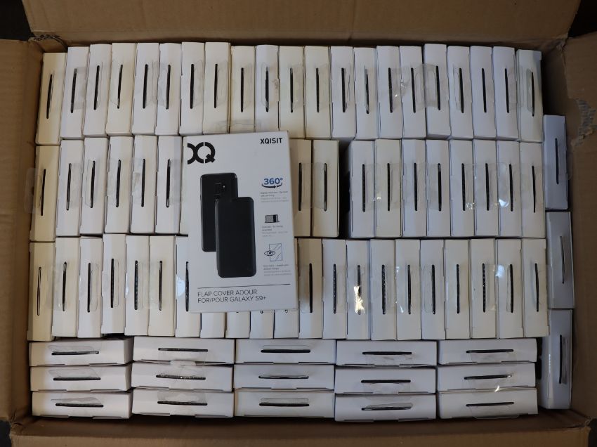 A quantity of boxed as new XQISIT Flap Cover Adour Phone Cases for Samsung Galaxy S9+ and Samsung Galaxy J3 2017 (Boxes sealed) (Approximately 80 items).