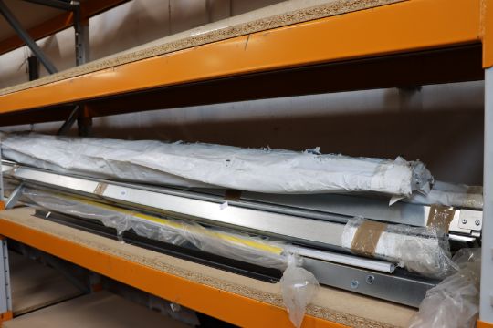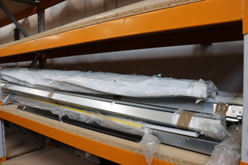 A shelf of miscellaneous items to include plastic tubing and metal support brackets.