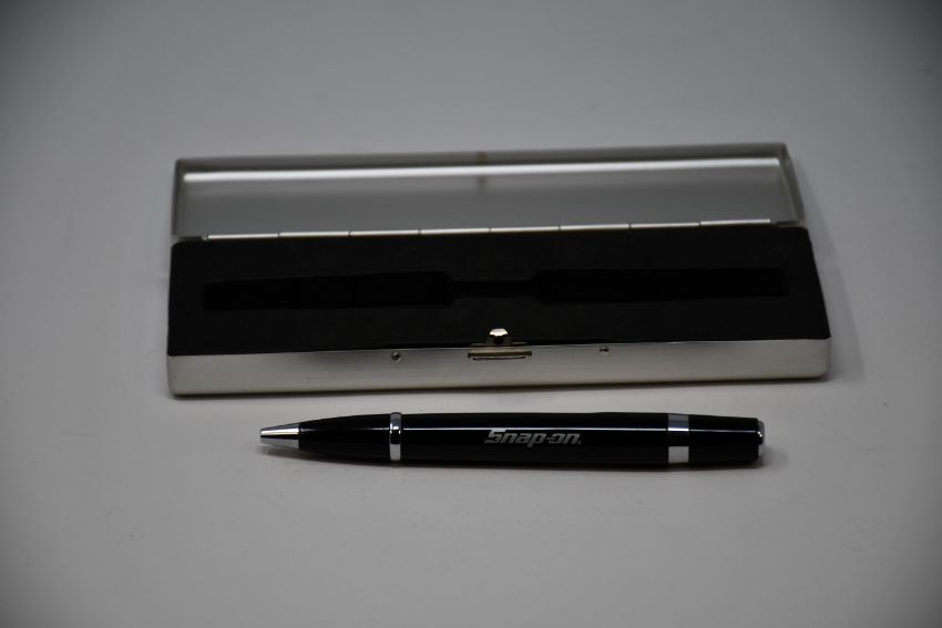 A Snap On ballpoint pen in black and silver with presentation case.
