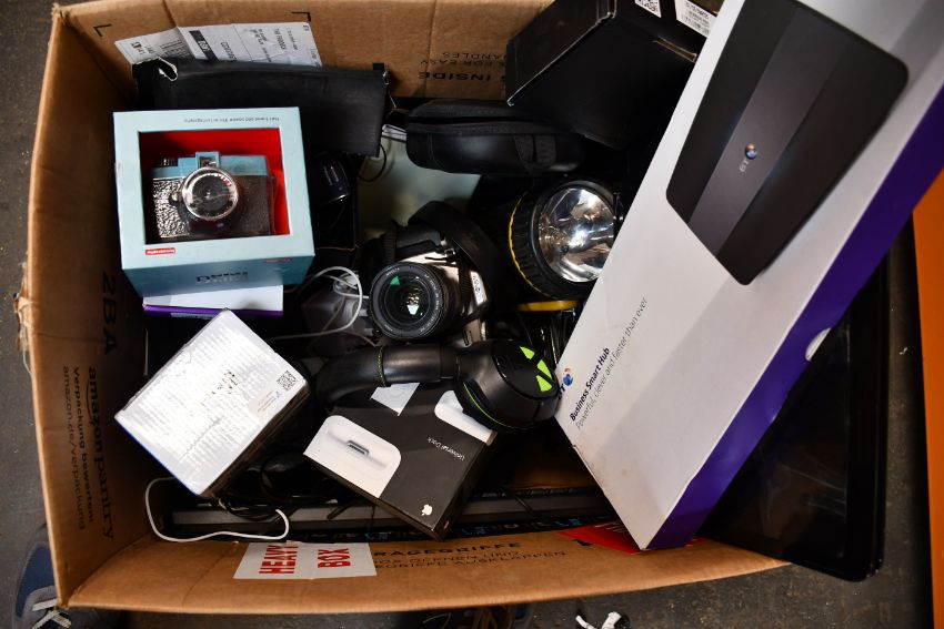 A box of assorted as new and pre-owned cables, small electrical items and accessories including mobile phones, cameras and a laptop.