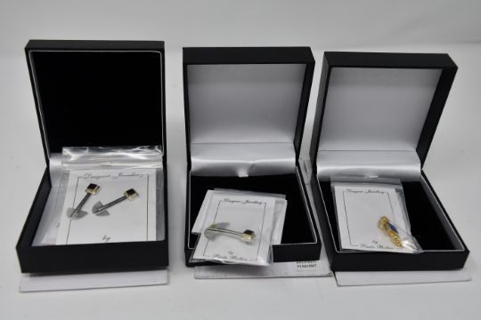 One pair of Bauhaus earrings, one Bauhaus pendant and one Vermeer pendant, all by Paula Bolton and all boxed as new.