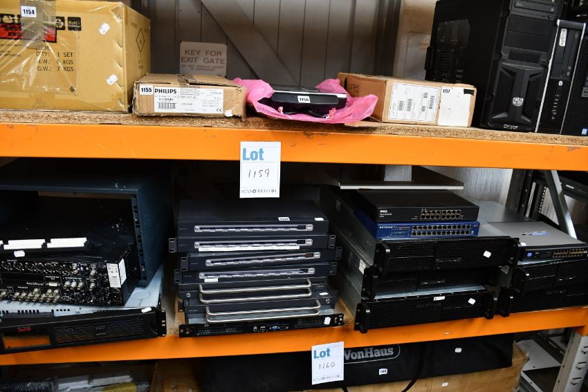 A quantity of IT items to include; an Avid Adrenaline edit controller, an APC 750 Smart UPS, two Belkin OmniView rack-mount consoles, a Dell PowerEdge 860 Server, four Belkin OmniVeiw PRO2 8-port KVM Switch, five empty server cases, a Dell Power Connect 2716, a Linksys SR216 16-port 10/100 switch, a Netgear FS524 16-port 10/100 switch, a Net-c Cat.5e 24-port, a heavy duty rack shelf and a 7ft wheeled server rack (20 items).