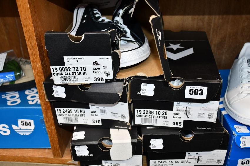 A pair of Converse All Star high tops trainers (UK 5), a pair of Converse Chuck Taylor All Stars clean lift trainers (UK 4), a pair of Converse All Stars OX V leather trainers (UK 3.5), a pair of Converse Chuck Taylor Craft OX trainers (UK 6) and a pair of Converse Chuck Taylor All Stars back to Shore OX trainers (UK 10).