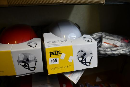 One Petzl Strato lightweight helmet in red, one Petzl Vertex ventilated helmet in white and one Petzl Grillon 5M spare rope, all as new.