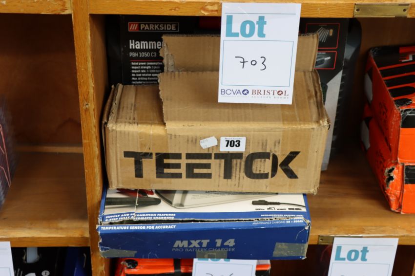 One boxed Teetok Angle Grinder (SG-803), one boxed CTEK Mxt14 - 24 Volt 14a Pro Battery Charger and one boxed Parkside Hammer Drill (PBH 1050 C3).