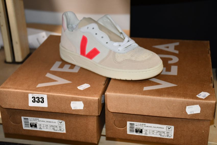 Two pairs of as new Veaj V-10 suede trainers (UK 4).
