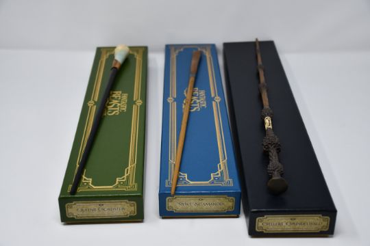 One boxed Albus Dumpledore noble collection replica wand (NN9906), one boxed Gellert Grinderwald noble collection replica wand (NN8086), three boxed Newt Scamander noble collection replica wands (NN5622), one boxed Leta Lastrange noble collection replica wand (NN871), one boxed Queenie Goldstein noble collection replica wand (NN5626), three boxed Nicolas Flamel noble collection replica wands (NN8079) and one boxed Hermione Granger Harry Potter replica wand (NN8411).