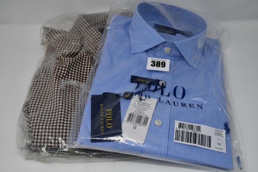 An as new Ralph Lauren custom fit classics button down brown shirt (XL) and an as new Ralph Lauren Polo slim fit easy care blue/white (Collar 16).