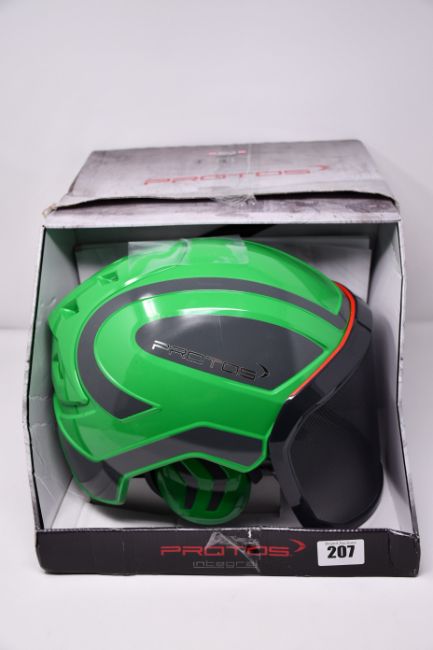 One boxed Protos Integral Arborist Helmet in green and grey.
