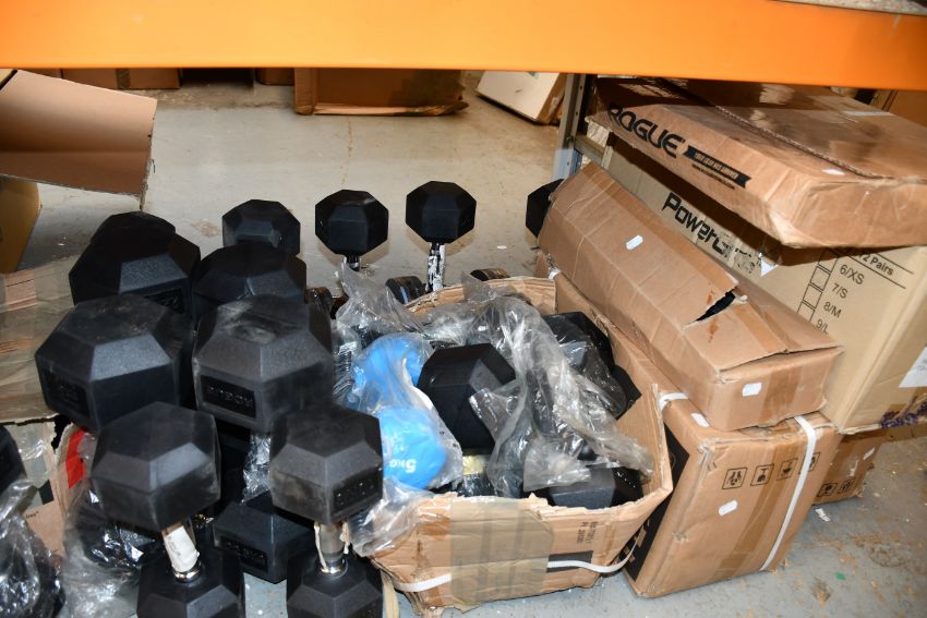 A quantity of weights and related items to include kettlebells and dumbbells of various size and weight.