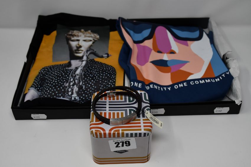 Two as new West Mark London boxed t-shirts; One Identity One Community (M) and Saxophone (M) and an as new Fossil Casual Texture leather bracelet (RRP €59).